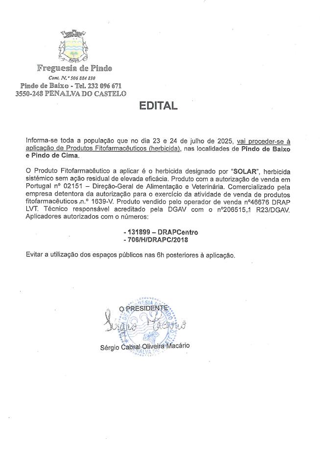 APLICAÇÃO DE PRODUTOS FITOFARMACÊUTICOS – HERBICIDA – Pindo de Baixo e Pindo de Cima – 23 e 24/07/2025