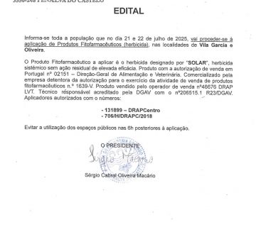 APLICAÇÃO DE PRODUTOS FITOFARMACÊUTICOS – HERBICIDA – Vila Garcia e Oliveira – 21 e 22/07/2025 Pedimos para retirarem as viaturas e outros para facilitar o processo ... Ler mais