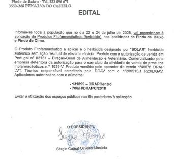 APLICAÇÃO DE PRODUTOS FITOFARMACÊUTICOS – HERBICIDA – Pindo de Baixo e Pindo de Cima – 23 e 24/07/2025Pedimos para retirarem as viaturas e outros para facilitar ... Ler mais